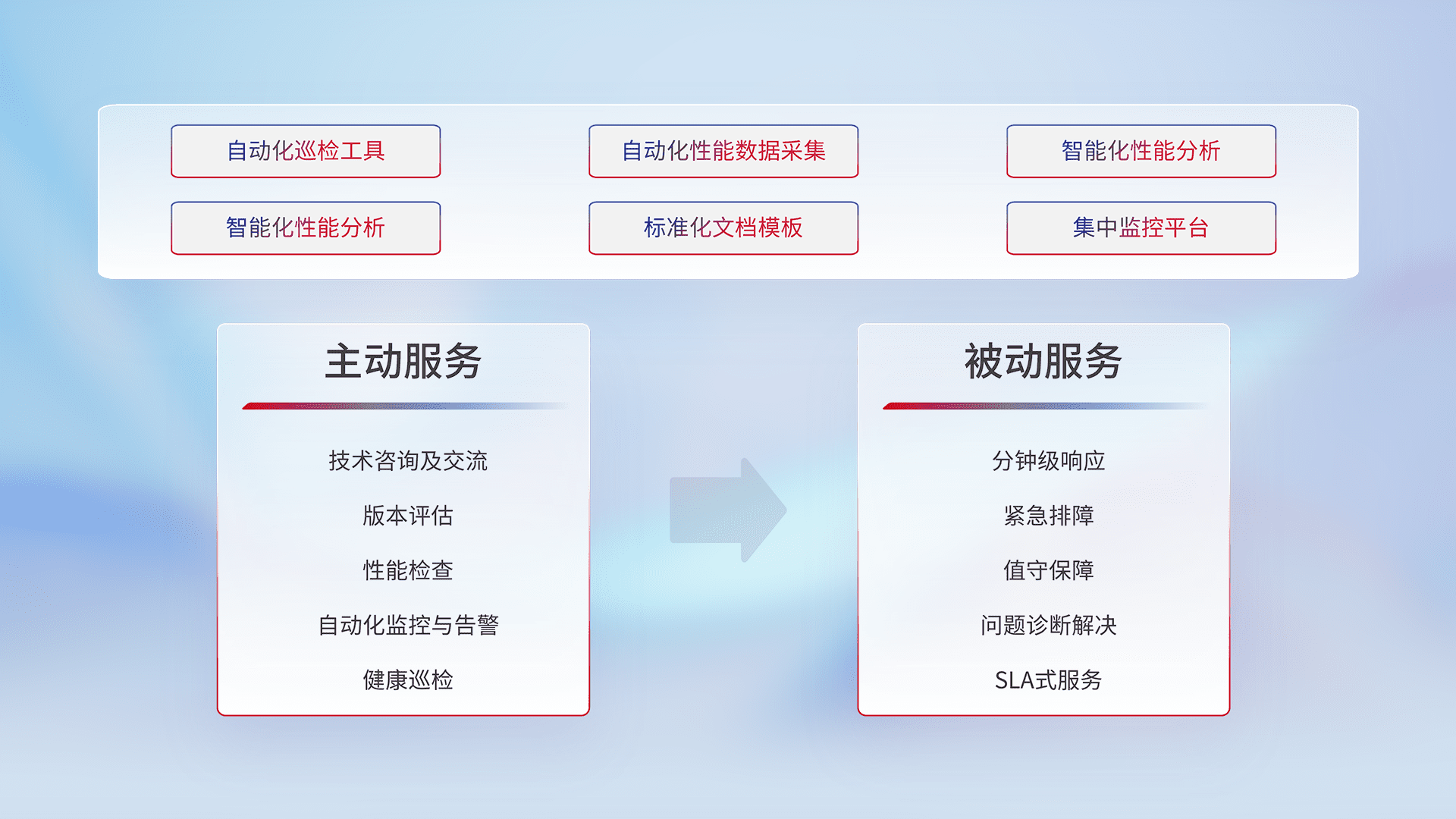 智能化工具和标准化文档,,保障服务质量,,提供主动服务(包含技术咨询、、、版本评估、、、性能检查、、自动化监控与告警、、健康巡检)和被动服务包含(分钟级响应、、、、紧急排障、、值守保障、、问题诊断解决、、、SLA服务)。。。